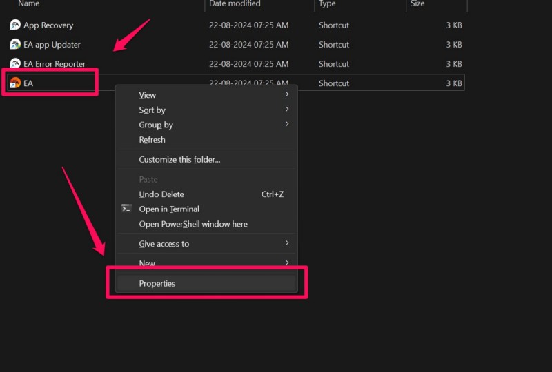3.Nyt,napsauta hiiren kakkospainikkeella EA-sovelluksen kuvakettaFile Explorer -ikkunassa ja valitseOminaisuudet-vaihtoehto.