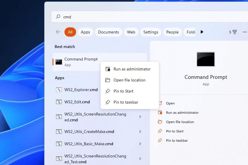 Vaihe 2:Kirjoita CMD ja komentokehotussovellus näkyvät muutamalla vaihtoehdolla. Valitse Suorita järjestelmänvalvojan vaihtoehtona.