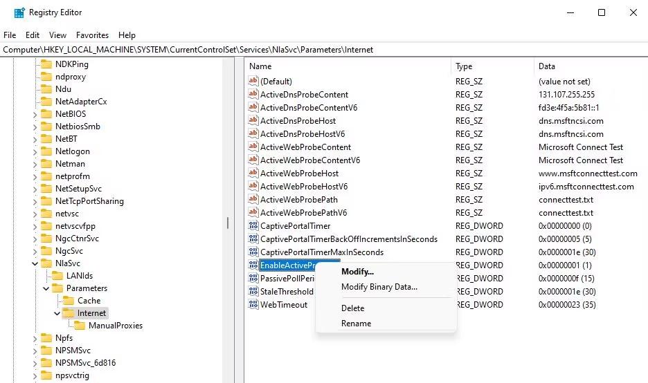 Vaihe 5:Etsi EnableActiveProbing DWORD rekisterieditorin oikeasta paneelista ja napsauta sitä hiiren kakkospainikkeella.