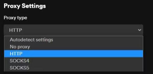 Voit mukauttaa tapaa, jolla Spotify muodostaa yhteyden Internetiin, valitsemalla yhden lukuisista käytettävissä olevista välityspalvelinasetuksista. Raporttien mukaan ongelmakoodi 4 voidaan korjata vaihtamalla välityspalvelimen asetukseksi HTTP. Spotifyn avulla voit valita HTTP-vaihtoehdon alla olevan kuvan mukaisesti: