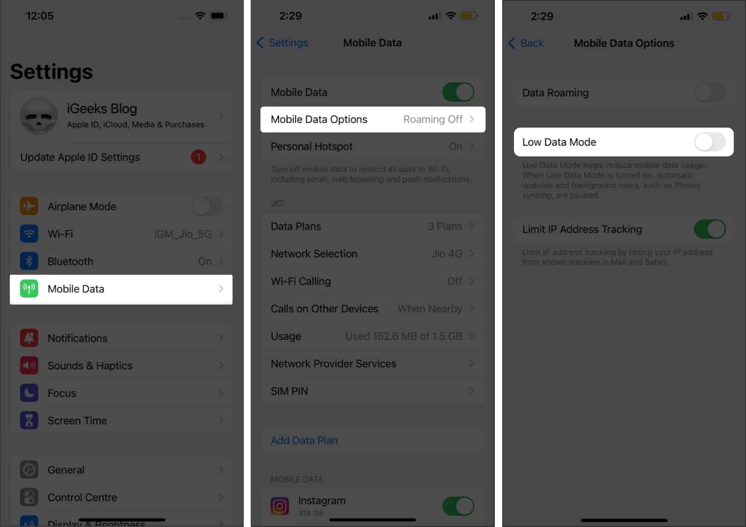 Matala datatila rajoittaa iPhonesi pääsemästä Internetiin täydessä kaasussa, kun se on kytketty matkapuhelintietoihin. Tämä voi vaikuttaa kuvan latauksiin ja tiedostojen synkronointiin iCloud -valokuviin ja sieltä. Siksi on parasta vaihtaa tämä pois, jotta voit olla varma, että se ei aiheuta ongelmaa laitteessasi.