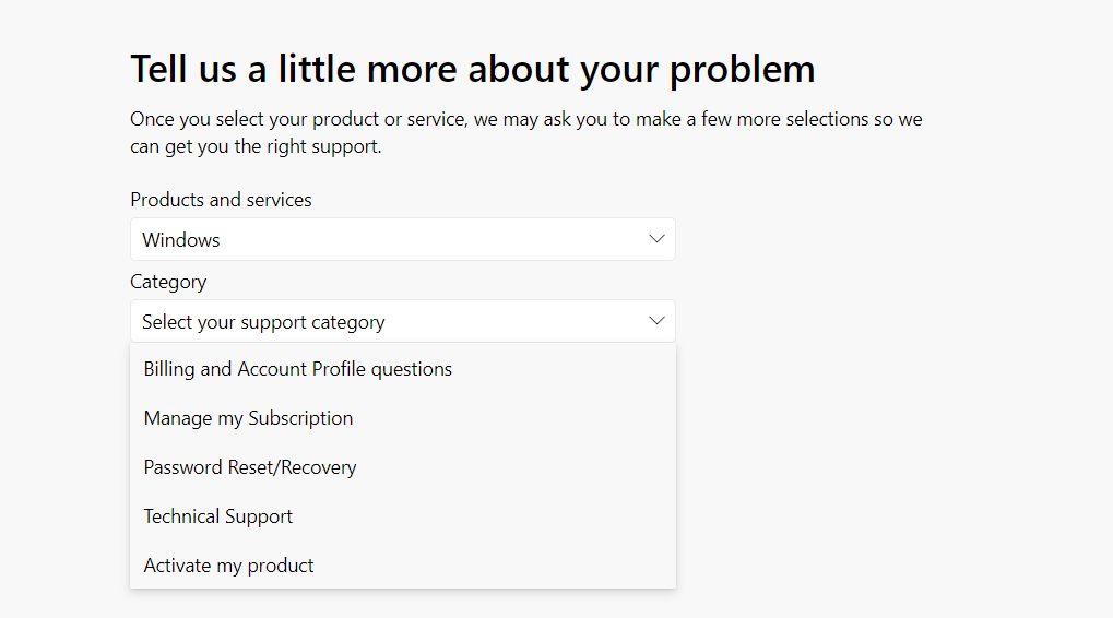 2.ValitseOta yhteyttä tukeen-painiketta ja valitse sittenWindowsvaihtoehto valikosta.