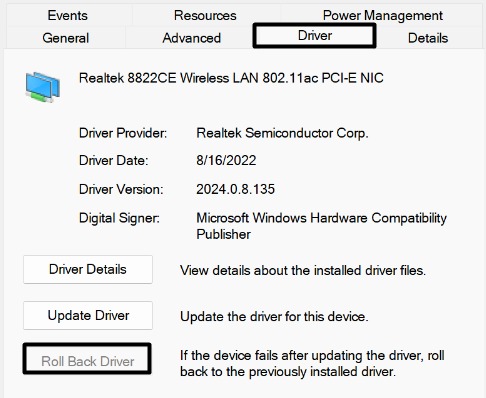 4.VuonnaKuljettajat-välilehteä, napsautaRoll Back kuljettajapalauttaaksesi ohjaimen edelliseen versioon.