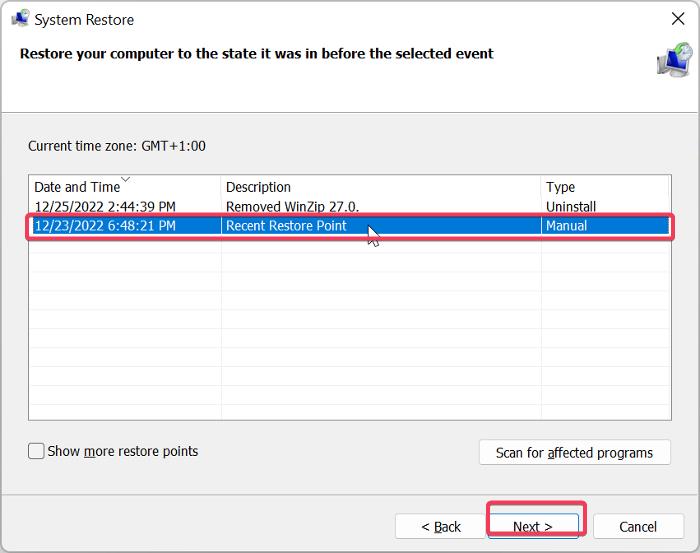 2.NapsauttaaJärjestelmän palautus…napsautaSeuraava>Painike, ja valitse sitten palautuspiste.