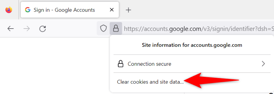 - Valitse osoitepalkin vasemmalla puolella oleva riippulukko -kuvake ja valitseTyhjennä evästeet ja sivustotiedot.