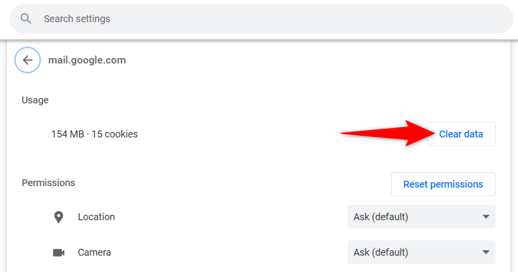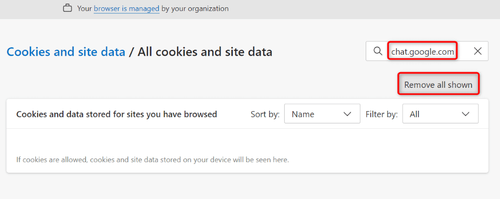 - Tyyppichat.google.comsiinäEvästeetlaatikko, valitsePoista kaikki esitetytja valitseSelkeäkehotuksessa. Toista tämä vaihe etsimälläGoogle.com.