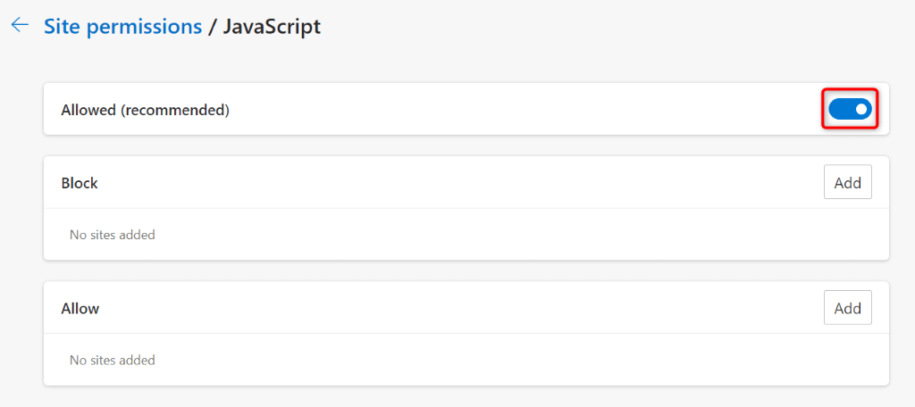 Javascript.Enabled - Valitse tämän merkinnän vieressä oleva vaihto ja varmista, että arvo sanoototta. Tämä osoittaa, että ominaisuus on käytössä.