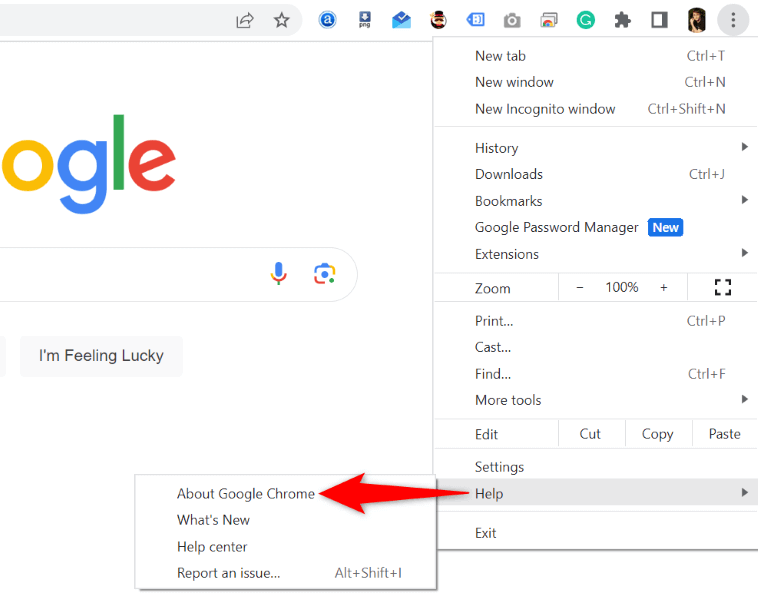 - Valitse kolme pistettä sisäänKromiOikea yläkulma ja valitseAuttaa-Tietoja Google Chromesta.