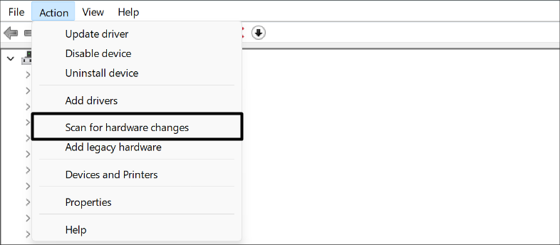 2.Kun olet valmis, valitseEtsi laitteistomuutoksiavaihtoehto kohteestaToimintayläreunassa olevasta valikosta asentaaksesi sen uudelleen laitteeseen.