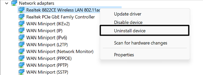 1.Vaikka sovittimien päivittäminen ei ratkaise ongelmaa, valitsePoista laite-vaihtoehto avattavasta valikosta poistaaksesi ne järjestelmästä ja asentaaksesi ne uudelleen.