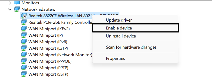 Suosittelemme ensin ottamaan ohjaimet uudelleen käyttöön. Jos WAN Miniport -verkkosovittimien ottaminen uudelleen käyttöön ei korjaa ongelmaa, voit harkita niiden päivittämistä. Olemme selittäneet, kuinka voit tehdä saman helposti alla mainituilla vaiheilla: