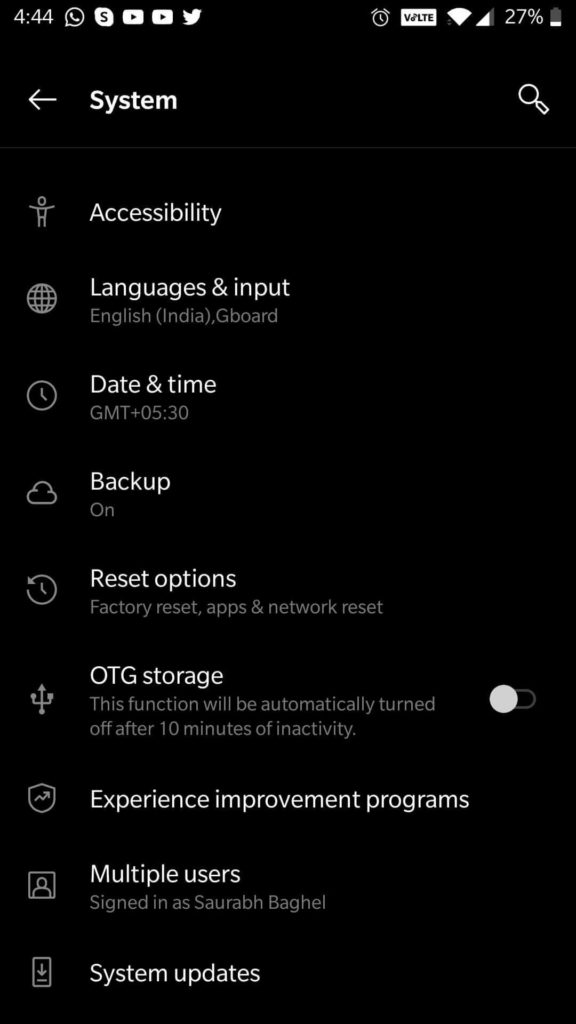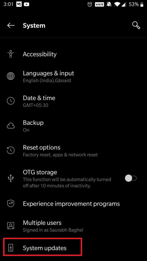 Jos haluat tarkistaa ohjelmistopäivitykset, siirry osoitteeseenAsetuksetSelaa Android -laitteessasi, vieritä alasJärjestelmäja napsautaJärjestelmäpäivitykset.Jos ohjelmistopäivityksiä on vireillä, lataa ja asenna ne.