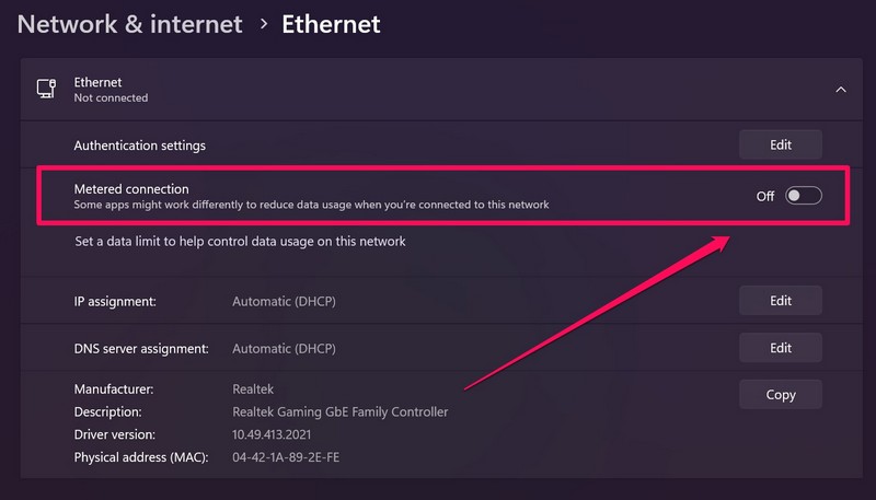 Siksi jotkut käyttäjät ovat ilmoittaneet, että Windows 11: n Ethernet -verkon Methernet -verkon käytöstä poistaminen voi ratkaista Windows Spotlight -ominaisuuden. Näin voit poistaa Mitatetun yhteysvaihtoehdon käytöstä Windows 11: n EtherNet -palveluun: