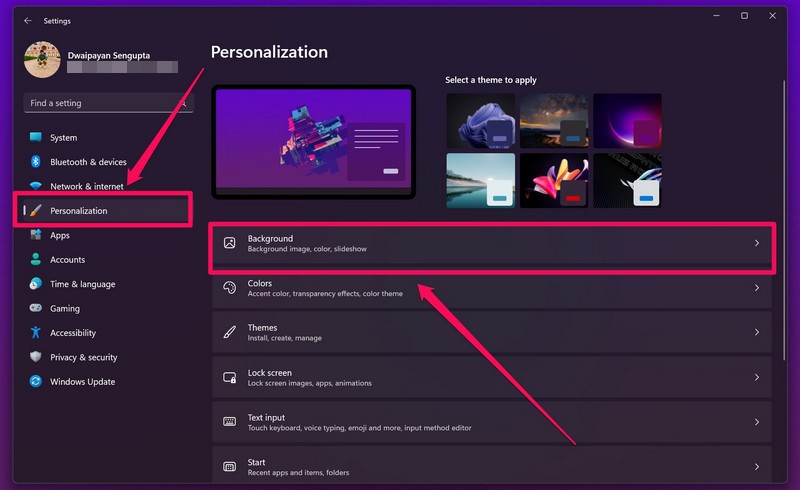 2.MennäPersoonallisuusVasemman Nav -palkin välilehti ja napsautaTausta.