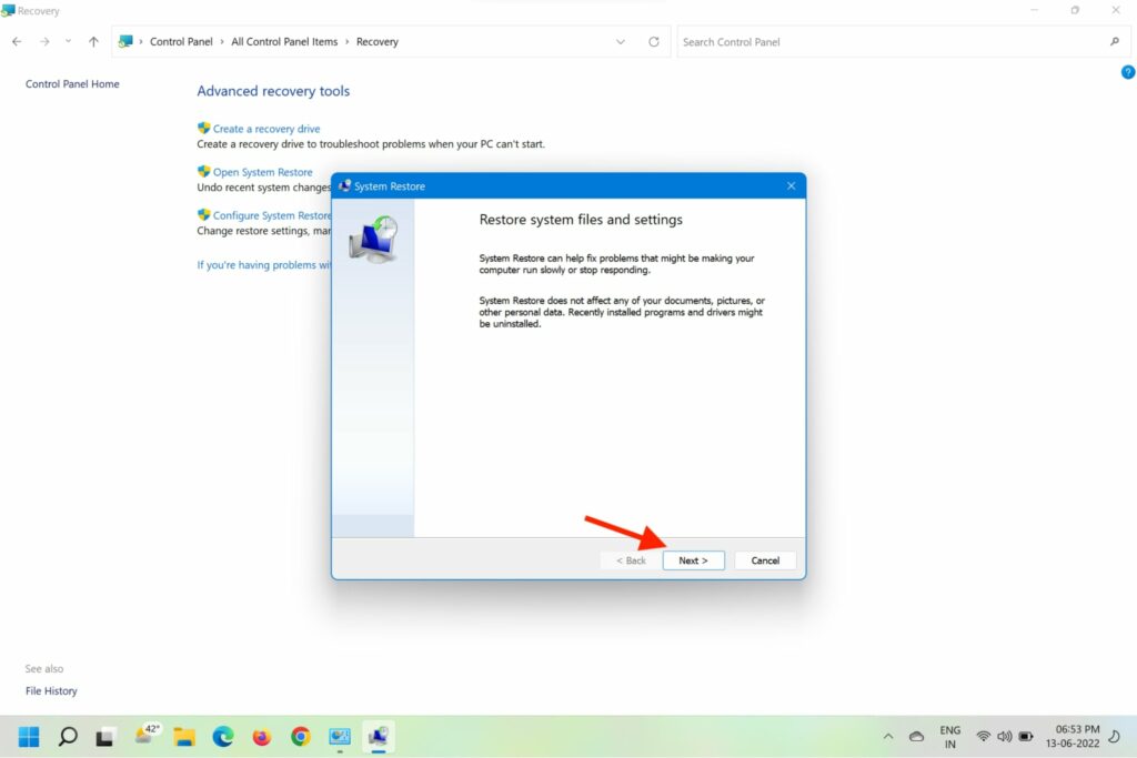 4.Napsauta nytAvaa Järjestelmän palautusvaihtoehto.