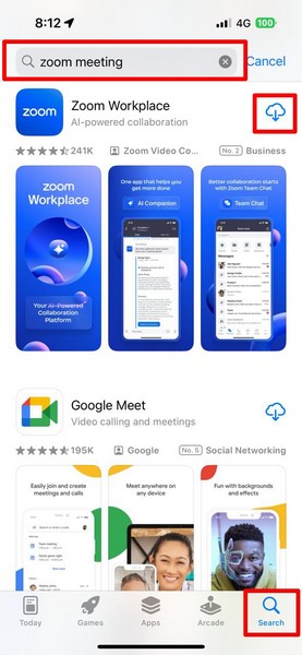 5.Siirry kohtaanHaku-välilehtialimmassa navigointipalkissa,käytä yllä olevaa hakupalkkialöytääksesi Zoom-sovelluksen, ja napautaLataa-painikesen viereen asentaaksesi uudelleen.