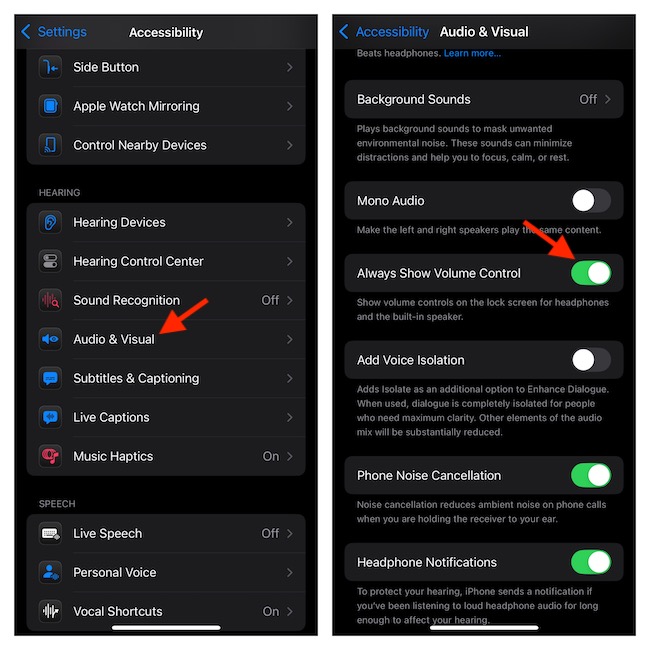 - Käynnistä Asetukset-sovellus iPhonessa > Esteettömyys > Napauta Kuulo-osiossa Ääni ja kuva > Poista käytöstä Näytä aina äänenvoimakkuuden säädin -kytkin.