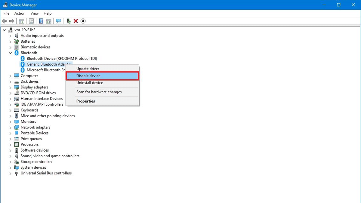 - LaajentaaBluetoothhaara> Napsauta hiiren kakkospainikkeella langatonta sovitinta ja valitsePoista laite käytöstävaihtoehto.