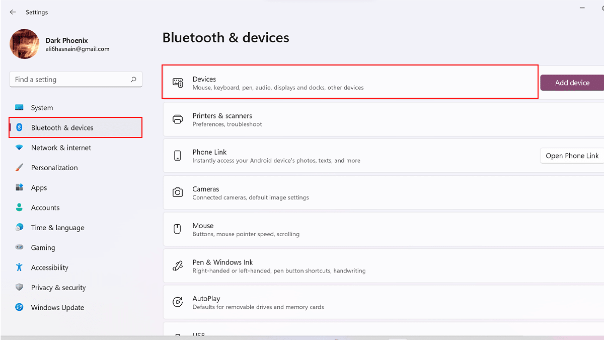 - AvataAsetukset> Napsauta "Bluetooth ja laitteet”> NapsautaLaitteet.