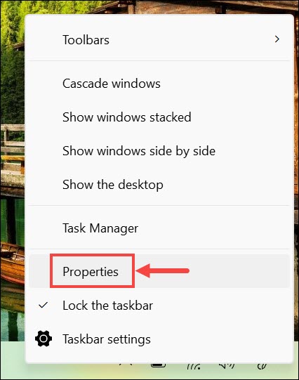 1.Napsauta hiiren kakkospainikkeella ”tehtäväpalkkia” ja valitseOminaisuudetValinta valikosta käynnistää ExplorerPatcher.