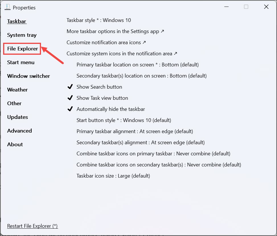 3.Kun olet tehnyt muutoksia, napsautaKäynnistä tiedostotutkija uudelleenVasemmassa alakulmassa olevaa painiketta käyttää niitä.
