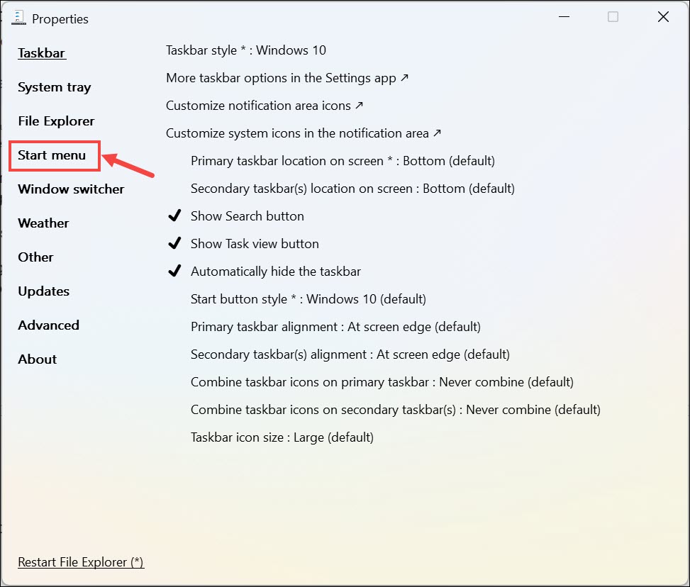 2.Vaihda ExplorerPatcher -käyttöliittymässäKäynnistysvalikkoosa vasemmalla.