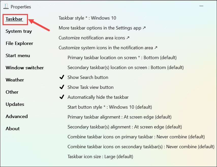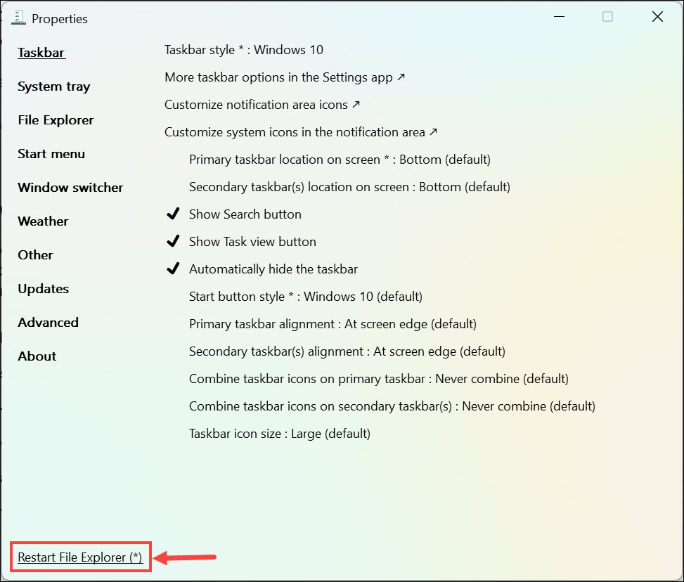 Tehtäväpalkin ulkonäön mukauttaminen ExplorerPater -käyttämällä: