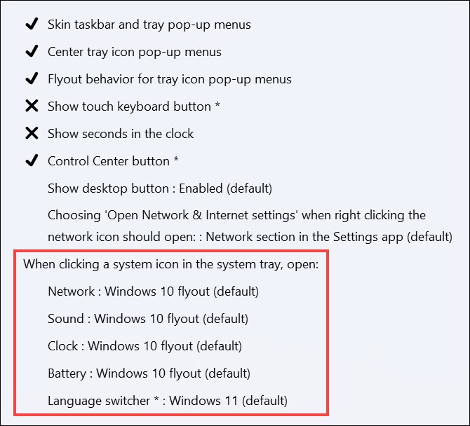 4.Voit myös ottaa käyttöön Windows 10: n vanhan Flyout -tyylinVerkko, ääni, kello, akku,jaKielikytkin.