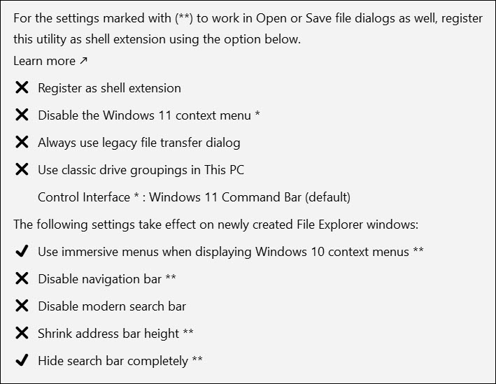 Tiedostotutkija -asetukset: ExplorerPatcher antaa käyttäjille mahdollisuuden säätää tiedoston tutkijan ulkonäköä ja käyttäytymistä. Käyttäjät voivat muuttaa kuvakkeen kokoa, mukauttaa navigointiruudun ja mahdollistaa lisäominaisuudet tiedoston selauskokemuksen optimoimiseksi.