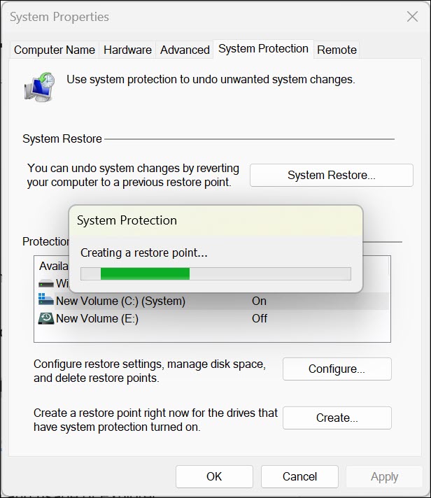 7.Muutaman hetken kuluttua järjestelmän palautuspiste luodaan.