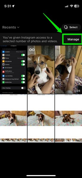 Tällä näytöllä voit napauttaaHallitapainattaa jhkLisää lisää mediatiedostojaInstagram -luetteloon ja videoihin, joita Instagram voi käyttää taiVaihda Instagramin valokuvien käyttöasetusTarjoamme sovelluksen täyden pääsyn, josta olemme keskustelleet alla.