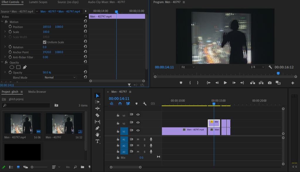 - Valitse yksi kopioiduista leikkeistä ja siirryVaikutuksen hallintapaneeli. MennäOpasiteettiarvoa ja aseta se50%. Sitten,Liikeavattava, vaihdaSijaintiarvot siten, että päällekkäinen kopio leike on hiukan pois alkuperäisestä. Tee tämä vaihe myös muiden kaksoiskappaleiden kanssa. Haluat muuttaa sijaintia ja mahdollisesti asteikon arvoja luodaksesi erämyymälän häiriöön. Voit myös pelata sekoitustilassa saadaksesi erilaisen ulkonäön.