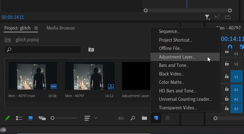 - Ensinnäkin, sinun kannattaa lisätä säätökerros aaltovaikutuksen soveltamiseksi sekä alkuperäisiin että kopioiduihin leikkeisiin. Siirry projektipaneelin oikeaan alakulmaan ja valitseUusi tuote> Säätökerros. Vedä seuraavaksi luotu kerros projektipaneelista V3-aikajanaan leikattujen leikkeiden yläpuolelle.