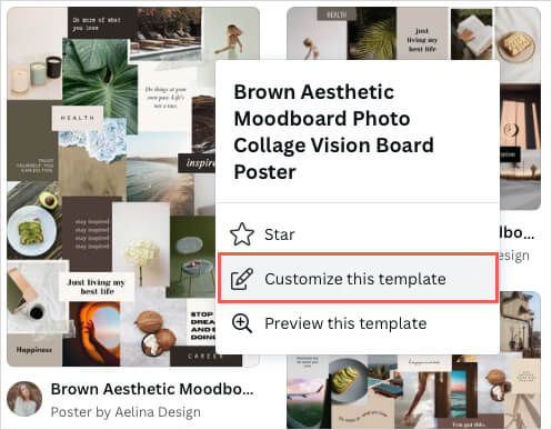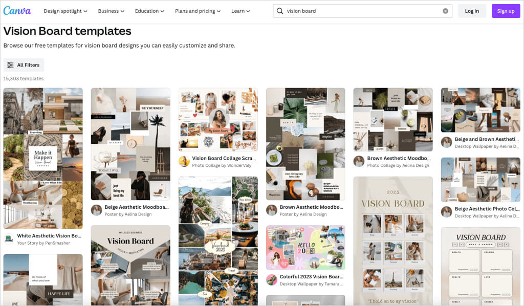 - Voit selata malleja osoitteessaVision Board Templates -sivu Canvalla. Voit kirjautua sisään Canva-tilillesi ennen mallin löytämistä tai sen jälkeen.