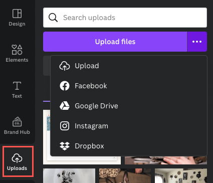 Jos haluat ladata omia kuviasi, valitseLatauksetvasemmalla. Käytä kolmea pistettä oikeallaLataa tiedostojavalitaksesi yhden tietokoneeltasi, Facebookista, Google Drivesta, Instagramista tai Dropboxista.