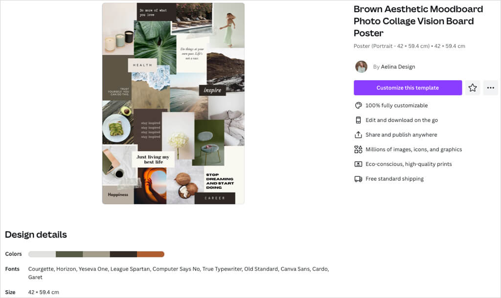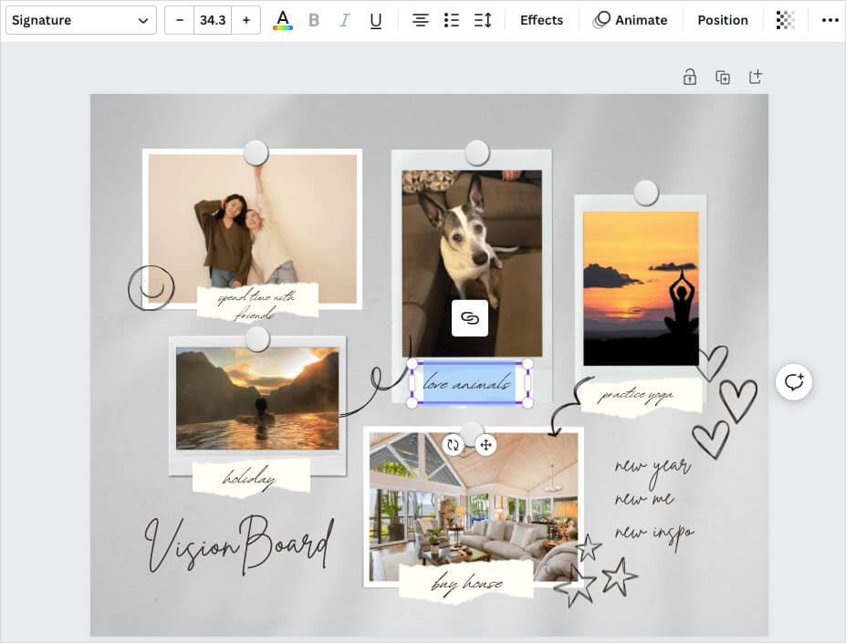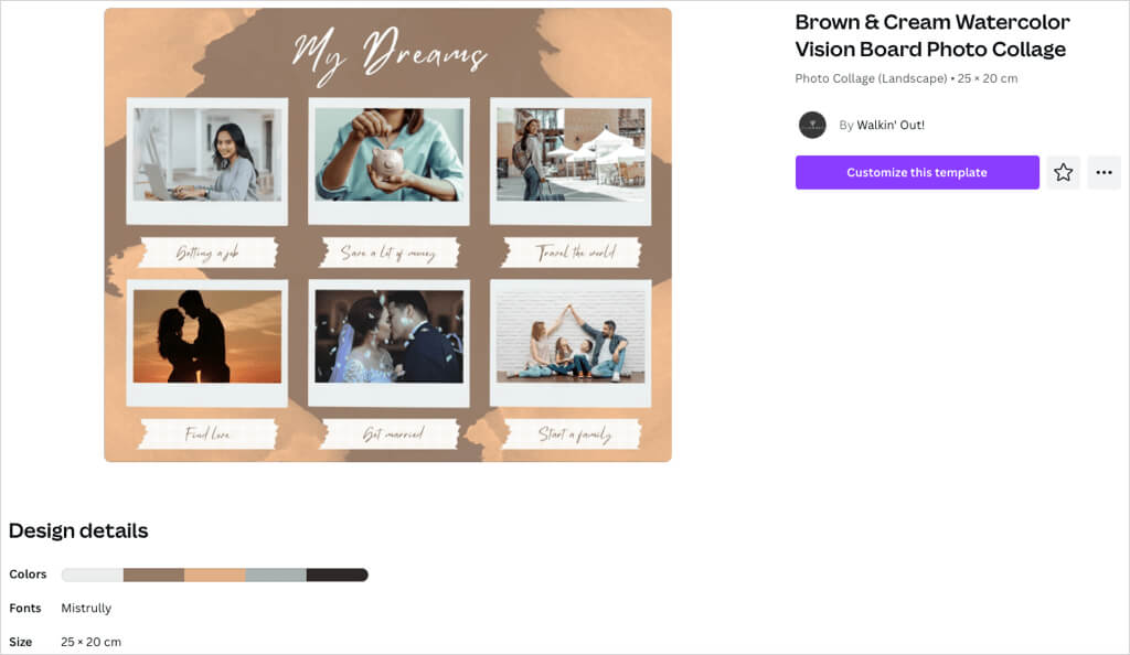 Käyttämällä Canva-mallia visiotaulusi luomiseen voit aloittaa perussuunnittelusta ja muokata sitä sitten. Tämä antaa sinulle enemmän aikaa keskittyä elementteihin, jotka haluat sisällyttää rakenteen sijaan.