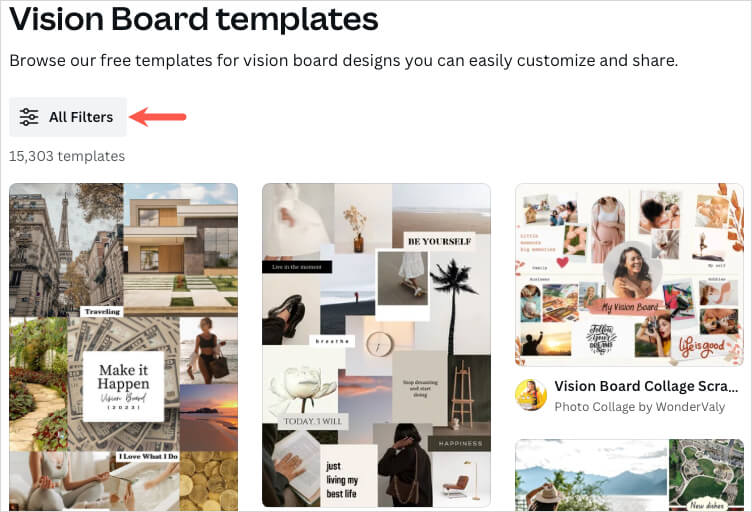 Onneksi Canva tarjoaa niin monia ilmaisia visiotaulupohjia, että näet todennäköisesti sellaisen, josta pidät, ilman koko sarjaa. Näin voit tarkistaa mallikokoelman ja suodattaa vaihtoehdot.