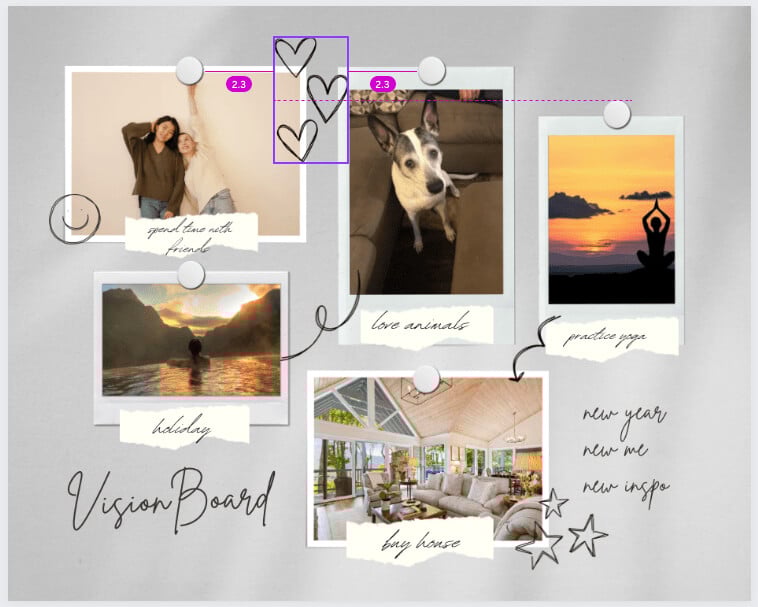 Jos haluat mieluummin yksinkertaisen vaakatyylisen taulun, jonka voit tallentaa ja avata milloin haluat, tutustu tähän Vision Board Collage Scrapbooking -malliin. Se antaa sinulle paikkoja sekä kuville että tekstille, mutta sisältää myös koriste-elementtejä.