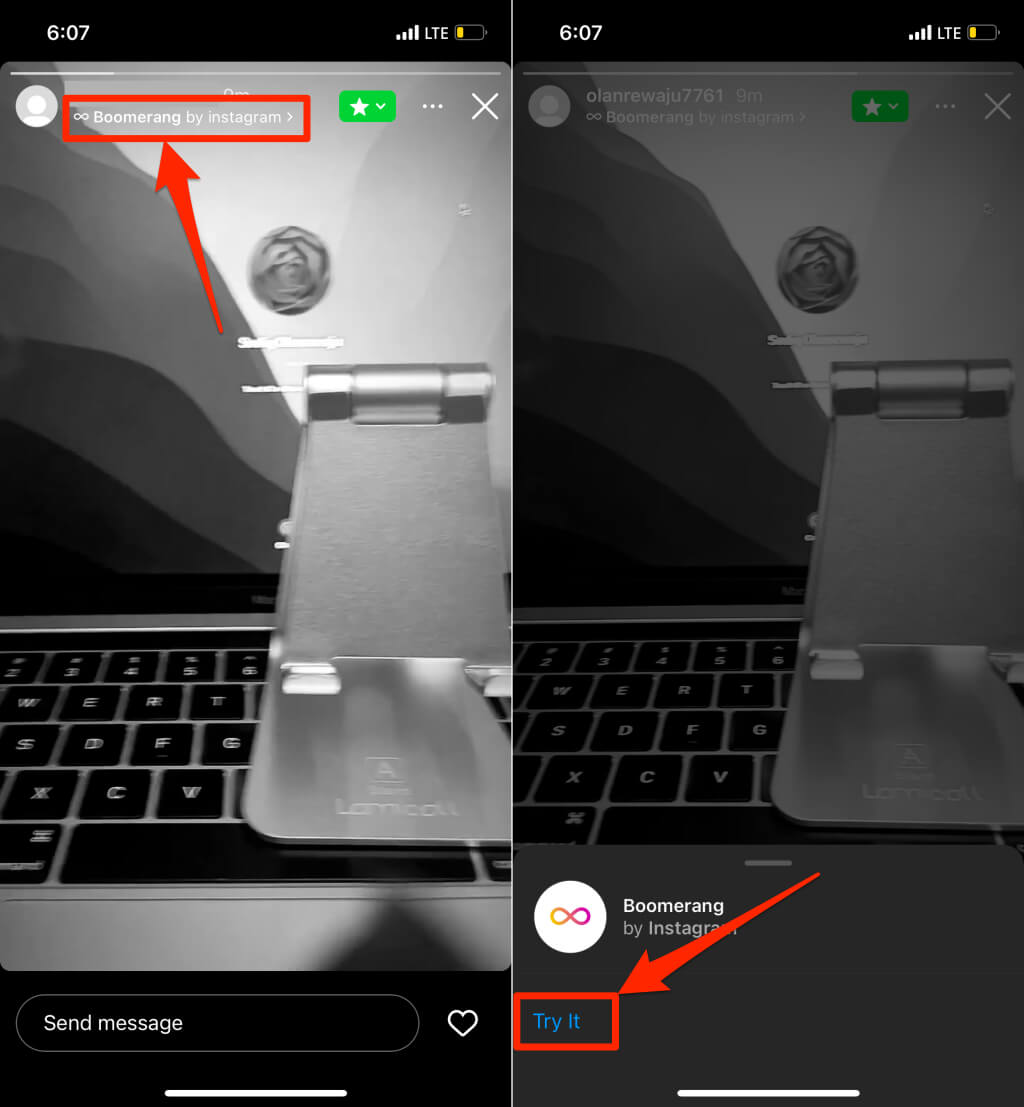 Seuraajasi tai läheiset ystäväsi näkevät boomerang -etiketin, kun he katsovat tarinaa. He voivat napauttaa tarraa ja valitaKokeilla sitäluoda bumerangin heidän laitteeseensa. Voit myös tehdä samoin katsellessasi bumerangeja ihmisten Instagram -tarinoissa. Napauta tarinan Boomerang -etikettiä ja valitseKokeilla sitä.