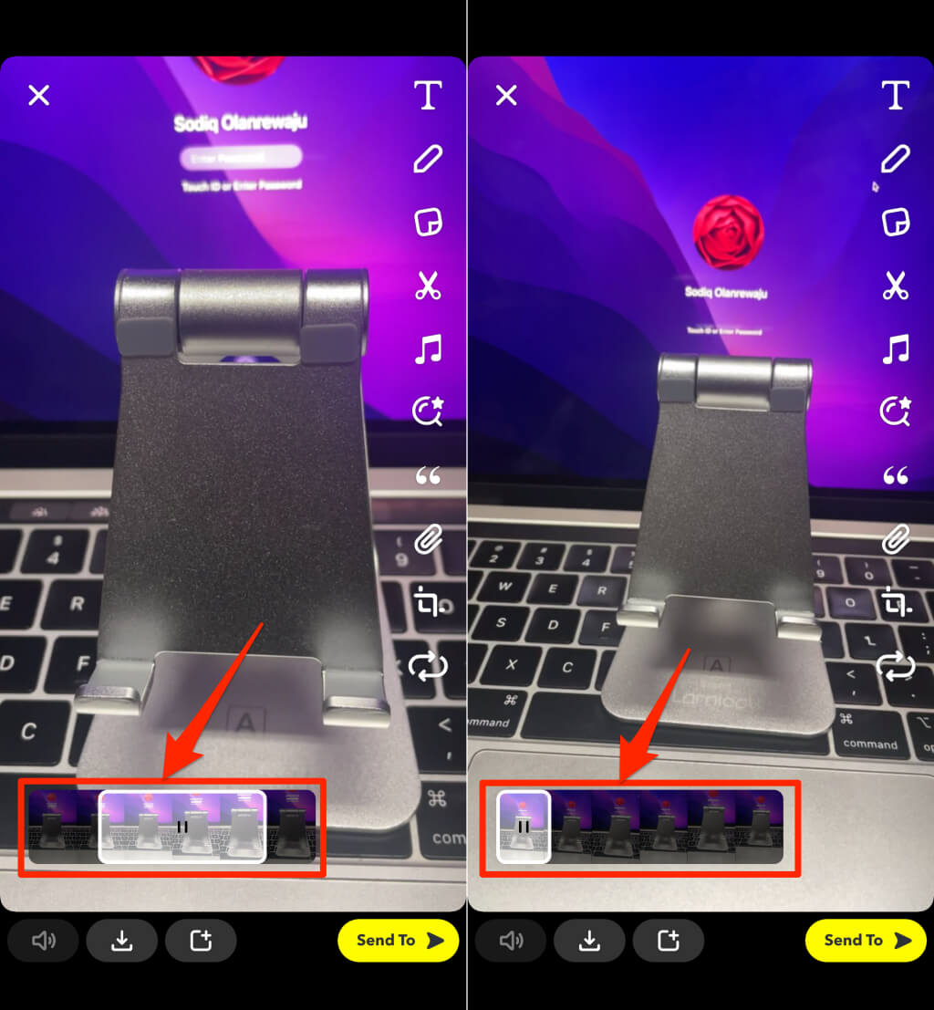 - Snapchat lisää ”pomppimisen” efektin nauhoituksen ensimmäiseen sekuntiin. Siirrä aikajanan korostus videon osaan, jonka haluat muuntaa poistumisleikkeeksi. Voit rajata/leikkaa pomppiovideon vain, jos tallennettu leike on pidempi kuin sekunnissa.