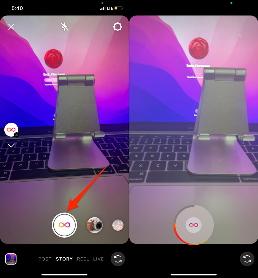 - Tallennuspainike muuttuu Boomerang -kuvakkeeseen. Napauttaanauhoituspainikeja vangitse aihe tai maisema, jonka haluat tehdä bumerangiksi.