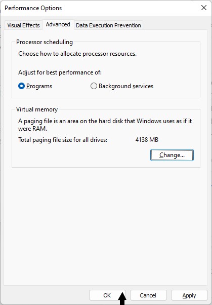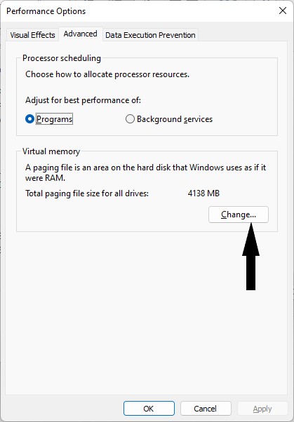 5. Nyt avoinnaEdistynytvälilehti. Seuraa valitsemallaMuuttaaaliVirtuaalimuisti.
