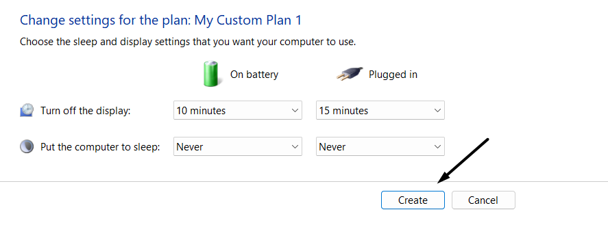 4.NapsautaSeuraavaksi-painiketta ja napsauta sittenLuodaluodaksesi uuden virrankäyttösuunnitelman ja tallentaaksesi muutokset.