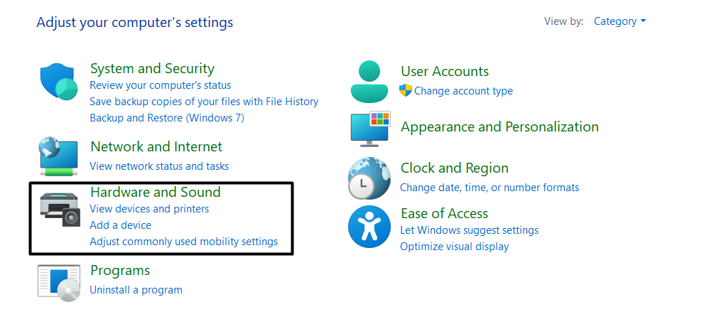1.AvaaOhjauspaneeli-apuohjelmaWindows-järjestelmässäsi ja napsautaLaitteisto ja ääni.