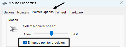 Windows 11:ssä on ominaisuus nimeltä Enhance Pointer Precision, joka nopeuttaa tai hidastaa hiiren osoittimen nopeutta sen mukaan, kuinka nopeasti vedät hiirtä. Tämä toiminto ei vaikuta pelin suorituskykyyn. Mutta se vaikuttaa pelikokemukseen.