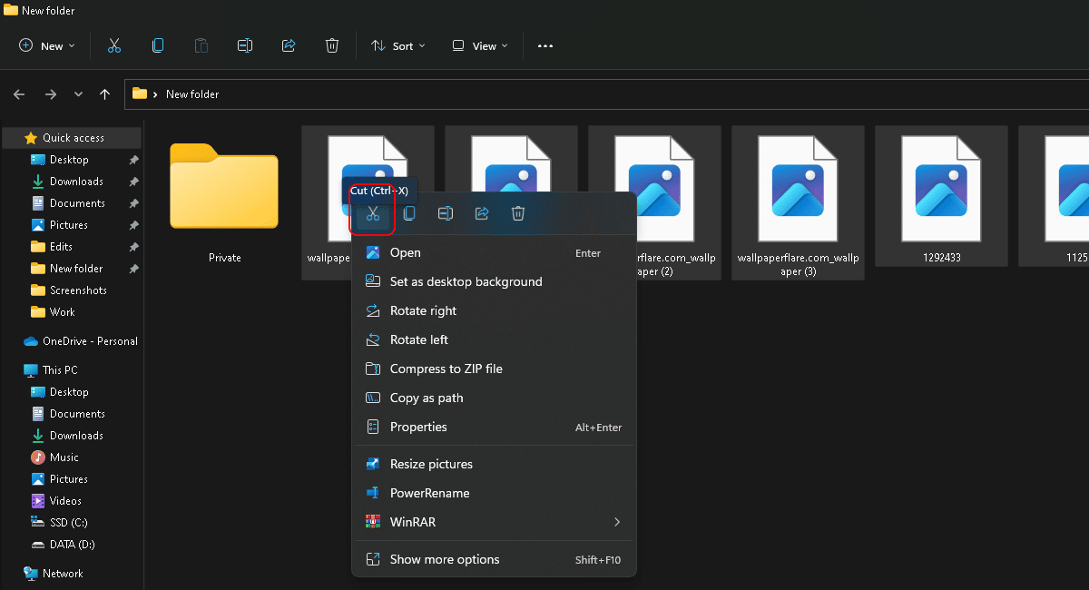 - Avaa yksityinen tiedosto > valitse kaikki tiedostot > leikkaa/siirrä tiedostoja painamalla näppäimistön Ctrl-näppäintä + X.