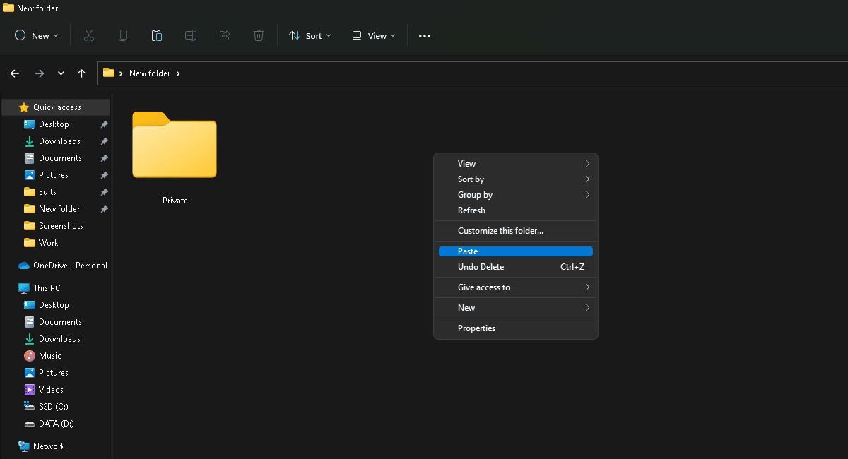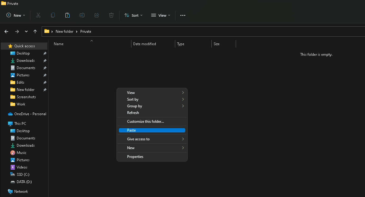 - Avaa yksityinen kansio > napsauta hiiren kakkospainikkeella > liitä tiedostot.