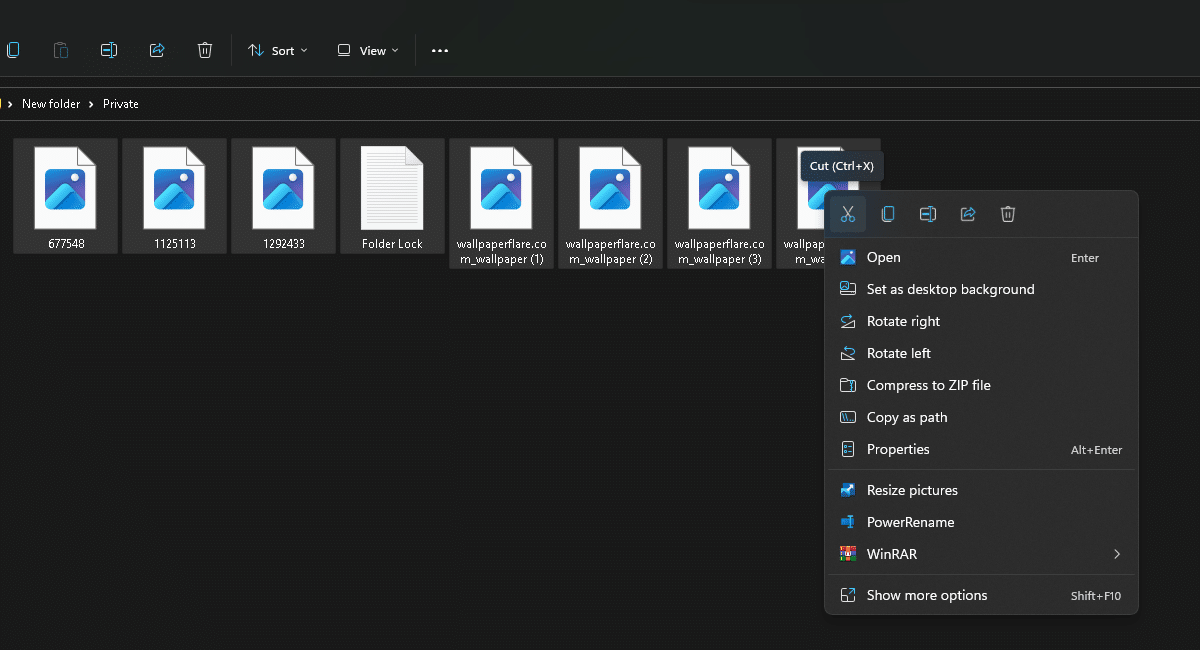 - Nyt voit lisätä kansion sisään tiedostot, jotka haluat piilottaa tai lukita. Valitse tiedostot > napsauta sitä hiiren kakkospainikkeella > leikkaa/siirrä tiedosto napsauttamalla saksikuvaketta.