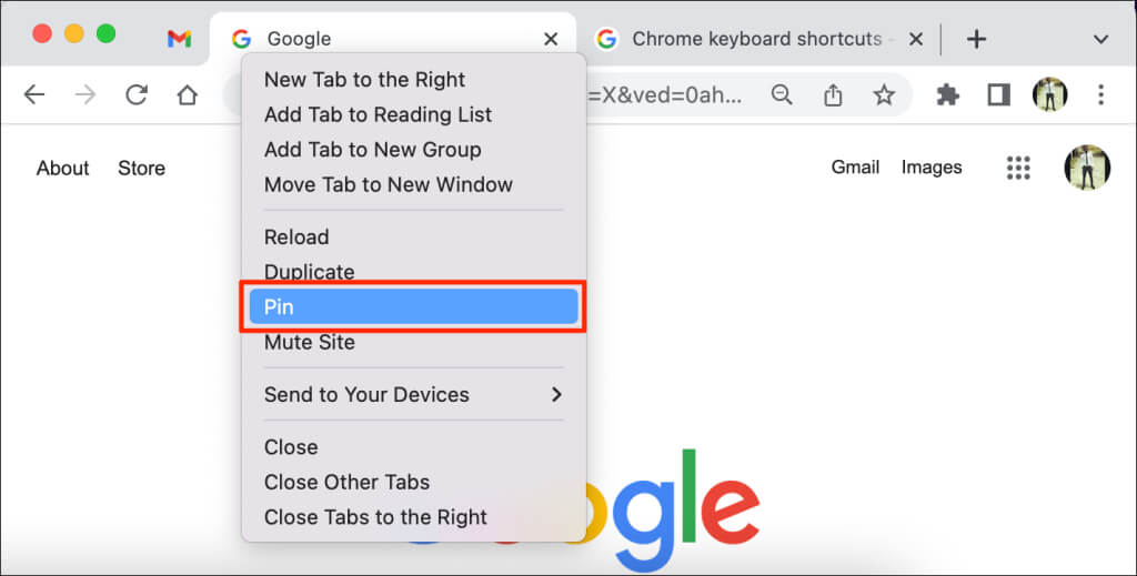 Vaihtoehtoisesti napsauta välilehteä hiiren kakkospainikkeella ja painaPnäppäimistölläsi. Chrome korostaaPinvaihtoehto valikosta. PainaEnter/Palatakiinnittääksesi välilehden.