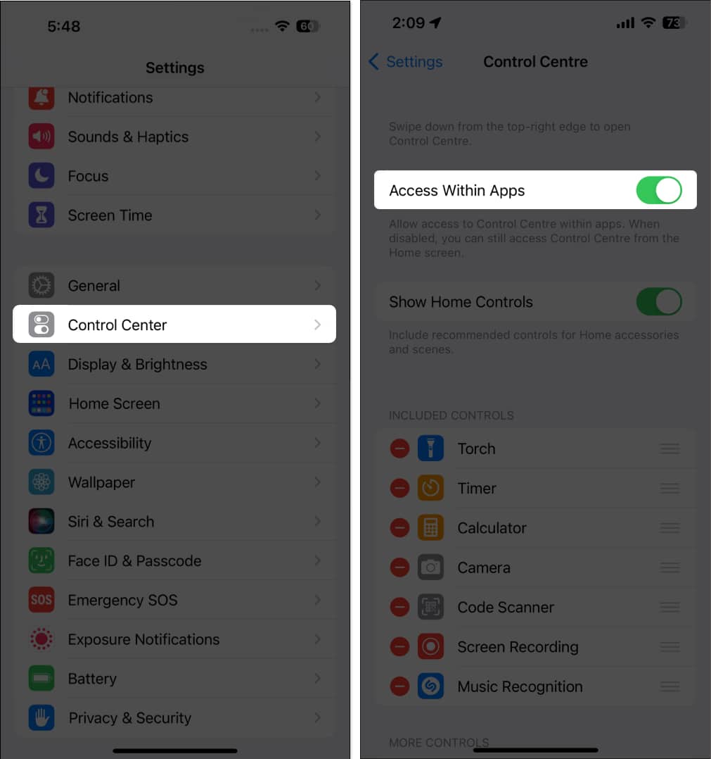 Päästä jhkAsetukset → Ohjauskeskus.VaihtaaPääsy sovelluksiinpäällä.